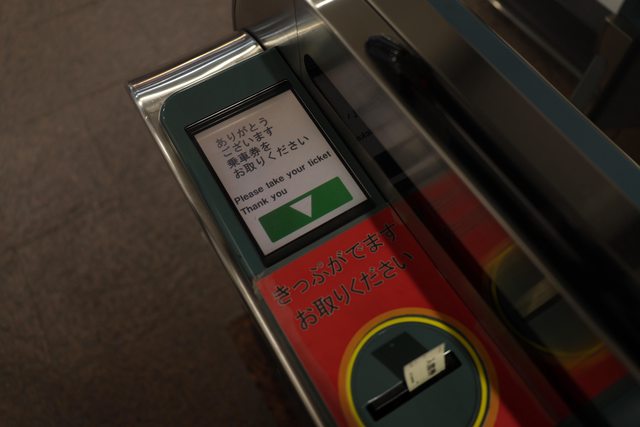 購票後會從售票機內掉出跟地鐵單程票相似的票券(但並非背磁票)