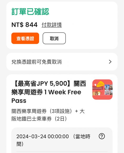 Klook購入 844元台幣 單張 兩張共1688元