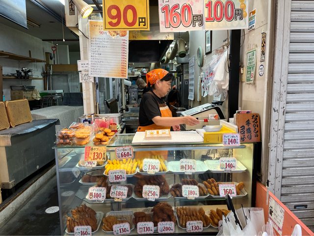 逛一下朝市,再到斜對面齋藤熟食店買些炸物、可樂餅。
