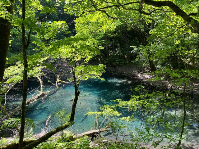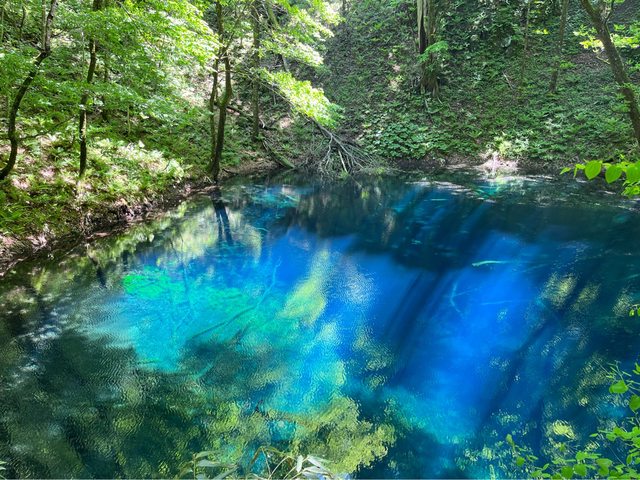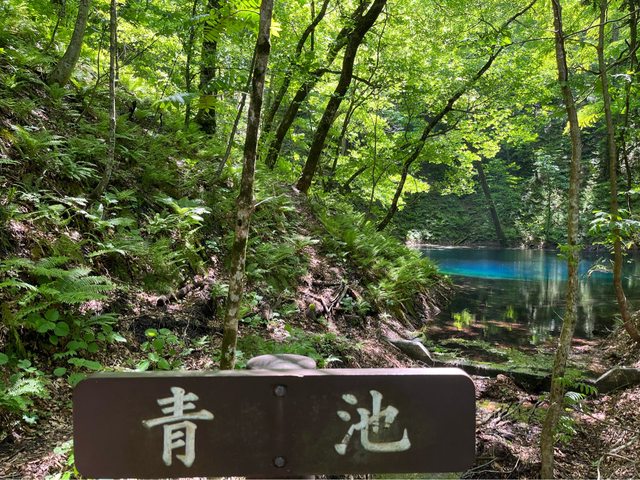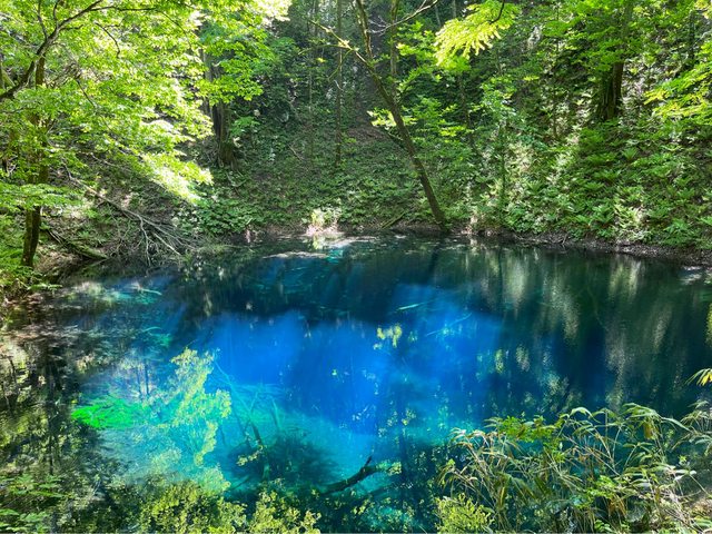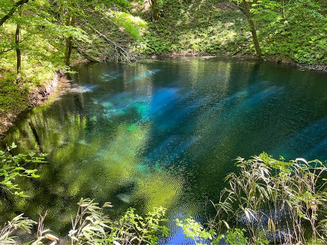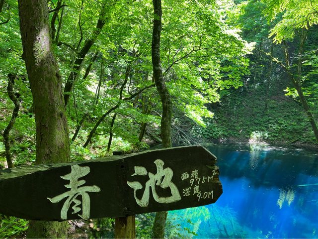 青池的水深9米,透過青藍色的池水也能看見悠遊水中的魚及沉在池底的樹木枯枝,足以