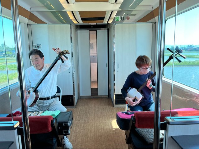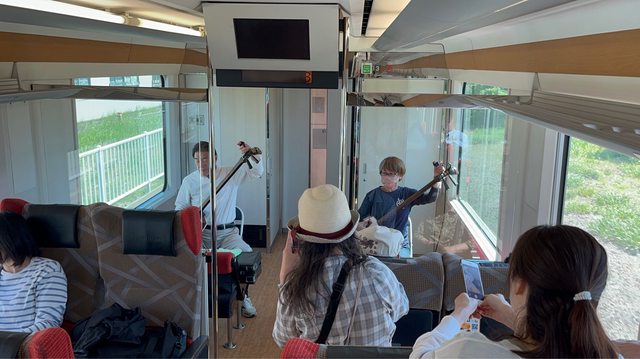 上特有的津輕三味線表演。我們與一些遊客也移動到3號車廂欣賞現場演出。表演結束後
