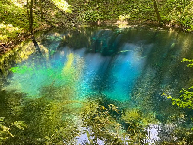 射下,整個池水呈現青色、藍色、綠色等色彩,也太美麗了吧!隨著陽光強弱轉換、微風