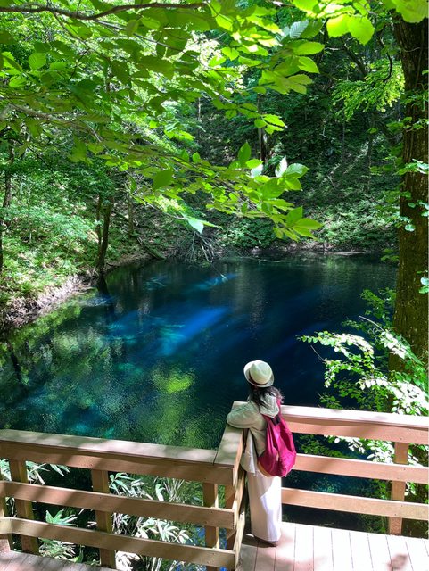旁邊有樓梯步道可以從上方俯視青池。今天的天氣很好,現在是正中午,在充足陽光的照