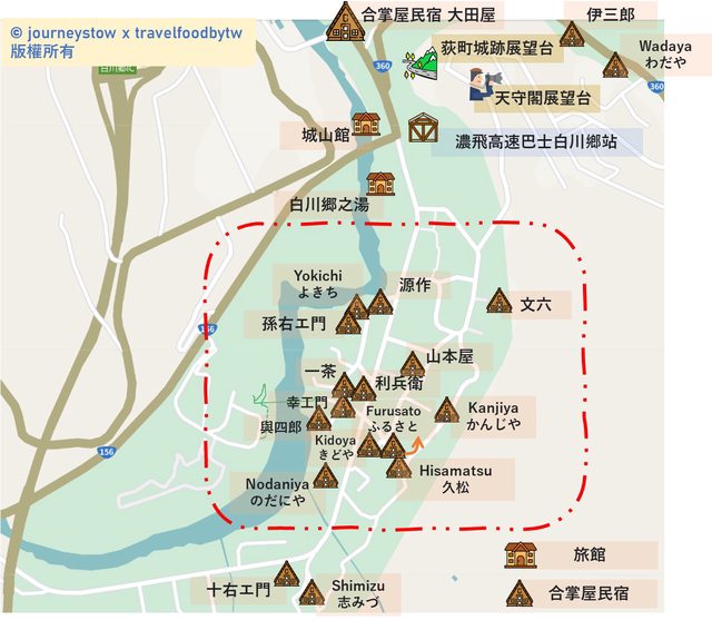 以下幫大家標出了,所有合掌造民宿與旅館的位置,