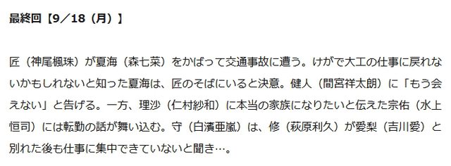 1.真的車禍了 2.匠因為受傷可能無法重返工作,夏海決定留在匠身邊 3.夏海對健人說不會再見面了 4.宗佑收到了調職通知 -- ※ 發信站: 批踢踢實業坊(ptt-web.org.tw), 來自: 1.169.89.138 (臺灣) ※ 文章網址: https://ptt-web.org.tw/Japandrama/M.1694523901.A.2B3