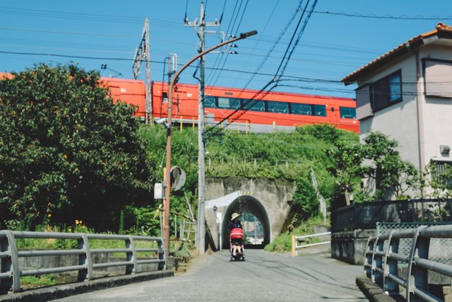 陘F等待疾駛而過的小田急線,站在鶴卷橋上仰望著隧道好一陣子。夏日藍天下的藍橘