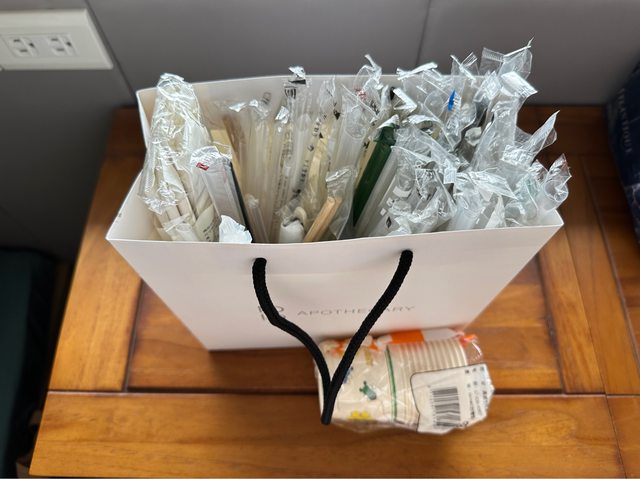 各式有塑膠套的免洗餐具、吸管一袋