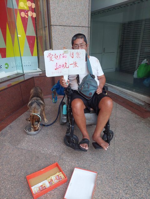 如題,前幾天在四維路上看到一位伯伯在馬路上坐在電動輪椅上,旁邊牽著一隻狗狗在過馬路,覺得狗狗很聰明,多看兩眼,後來在新光三越和Sogo的建築中間看到伯伯和狗狗在賣彩票,狗狗坐在一旁吃飯,非常乖,伯伯只拿了一個紙板寫他有賣彩票,沒有排出來,問他買,他用一隻手拿出一個盒子,說他沒有力氣,讓我自己選。
