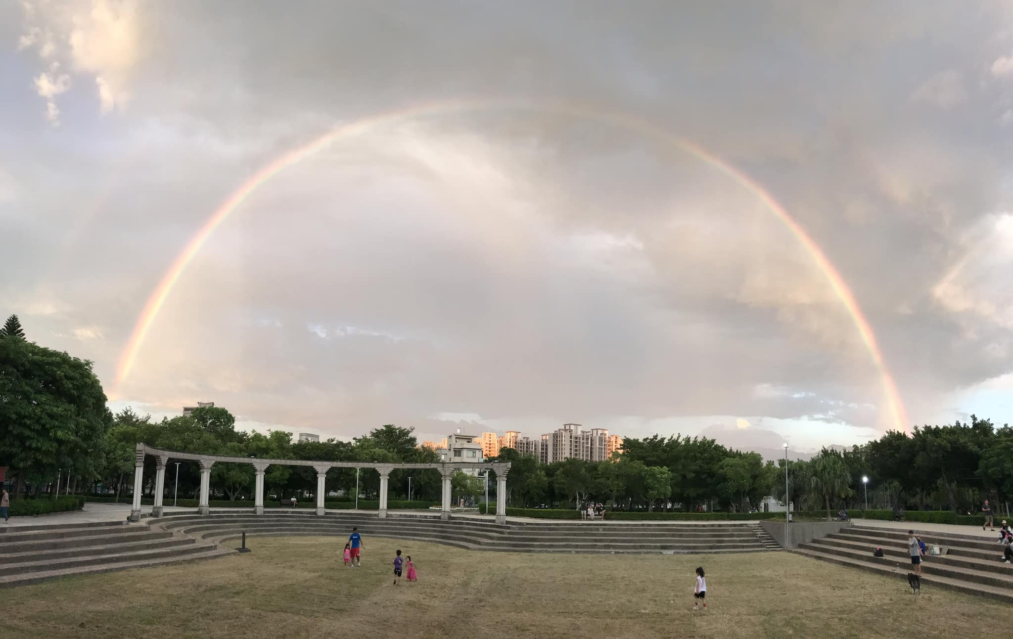 高雄市今天傍晚的天空出現斗大彩虹伴隨霓虹,繞著街道呈完美半圓的神奇景象,讓目睹的