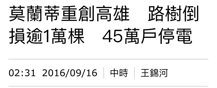 → luba2 : 莫蘭蒂真的超猛,那時候衛武營倒一大堆樹 09/04 14:28