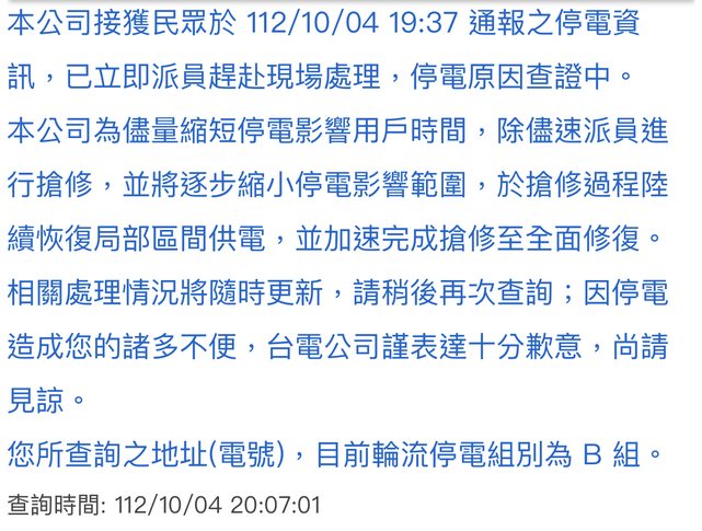 → enjoyyou : 不知道幾點復電了 感謝台電相關人員~ 10/05 04:12