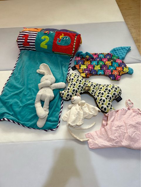 2. 二手寶寶用品(練習抬頭的趴墊、La Millou 豆豆枕+推車枕、mamas&papas安撫兔子