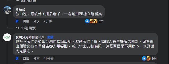 網址 https://www.facebook.com/groups/streetobservation/posts/742441771139752 馬上就有人知道在趕猴子 派出所也有回覆XD https://i.imgur.com/Zb9X3ZP.png