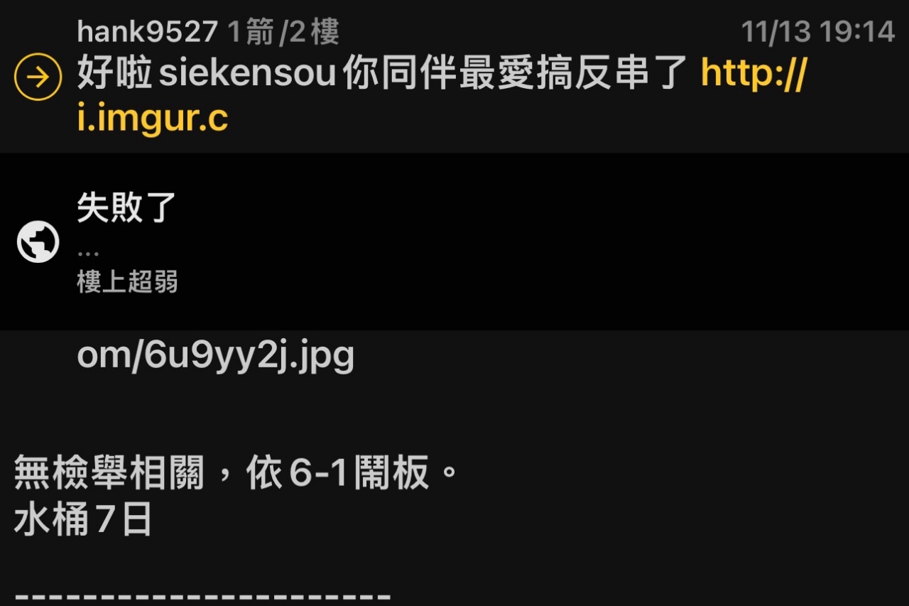 推 hank9527 : 檢舉一言堂siekensou 好可怕喔 11/22 11:02
