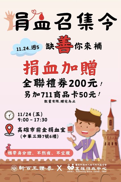 推 abcrr123 : 純推不領,高雄缺血,大家多多捐血,好人一生平安11/23 08:23