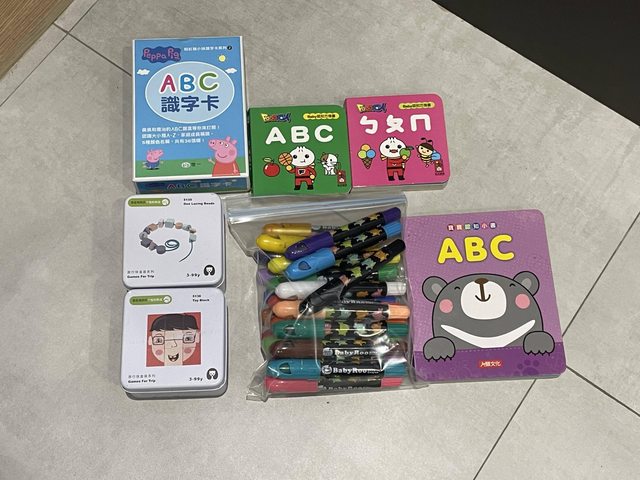 1.蠟筆、ABC、可以攜帶著玩的拼圖和穿線玩具