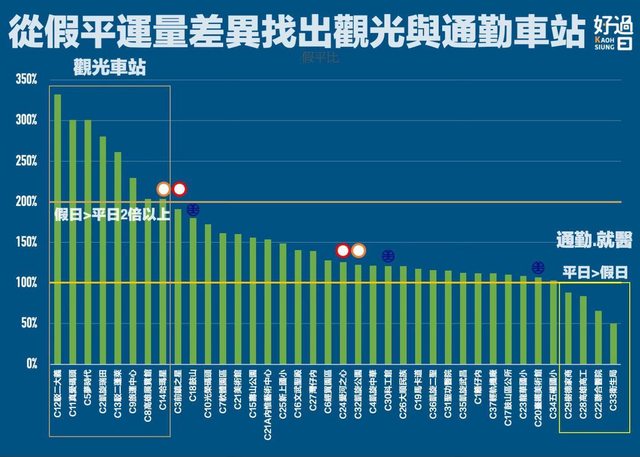 但也有4個車站,呈現平日多於假日的趨勢,包含以學生通勤為主力的高雄高工、樹德家商
