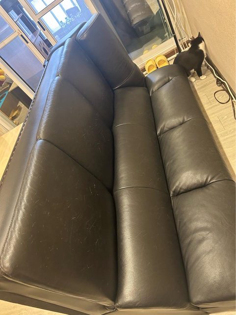 沙發表面傷痕累累,及底下破底都是家屁孩貓造成