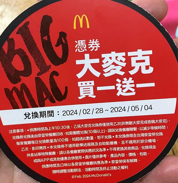 標題[贈送] 大麥克買一送一券(至5/4)已贈出