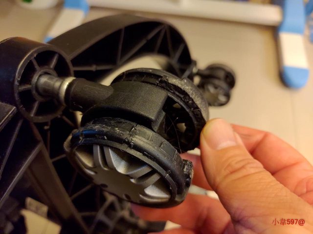 輪子的內側軸卡進毛髮與塵灰,造成滑動不順暢。