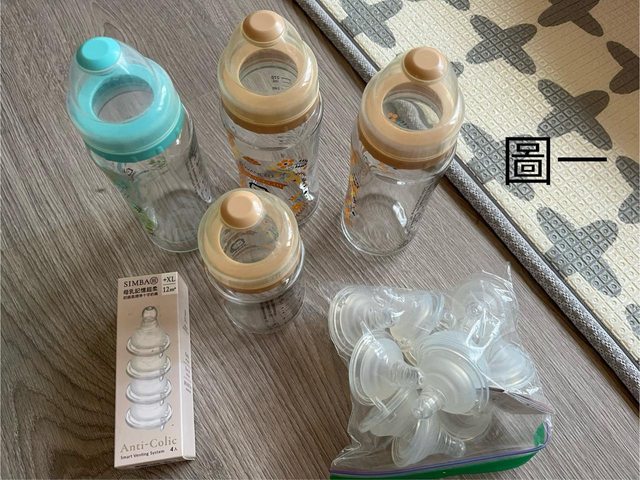 1) 圖一:二手玻璃奶瓶+全新多尺寸奶嘴頭