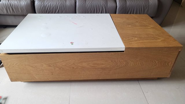 有抽屜能收納,收納空間大,白色為貼皮,有斑駁和彩色筆顏色貼紙殘留可自行處理。