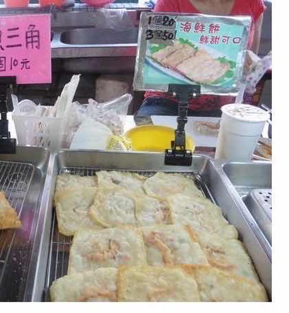 大家好,之前在東港漁市場有吃過這種海鮮餅,有點像水餃皮包蝦仁餡料再炸過,不會像