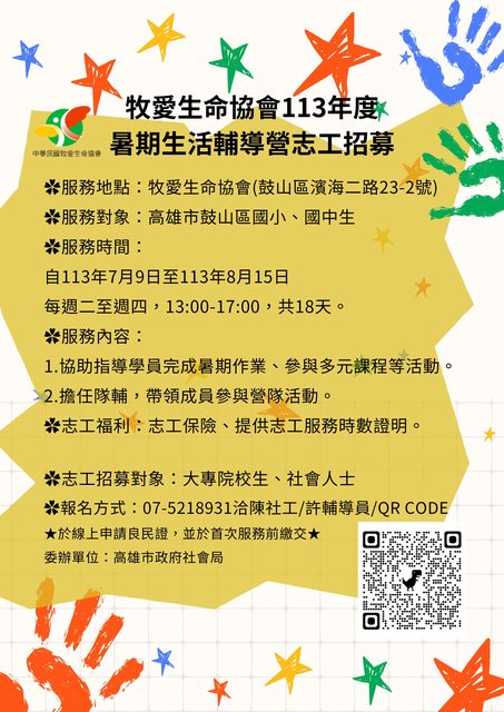 標題[招募] 牧愛生命協會113年暑期輔導志工招募中