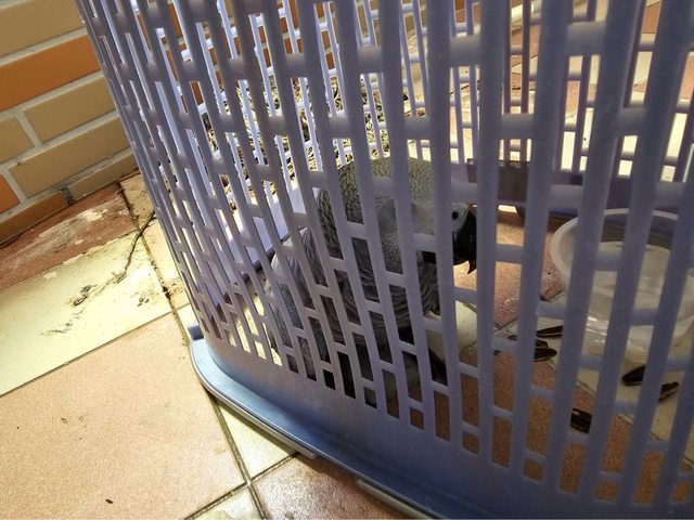 高雄朋友家前二天陽台飛來了一隻灰鸚,今天第三天朋友有用洗衣籃蓋起來,朋友沒有養