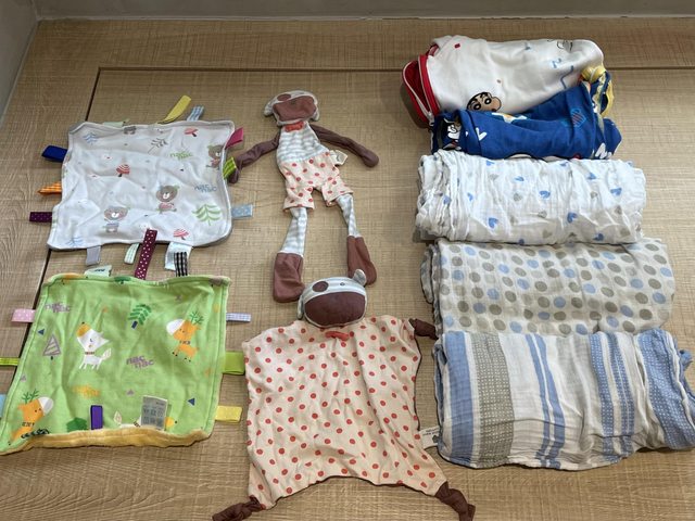 1.嬰兒安撫巾、小被被三件、連身睡衣2件