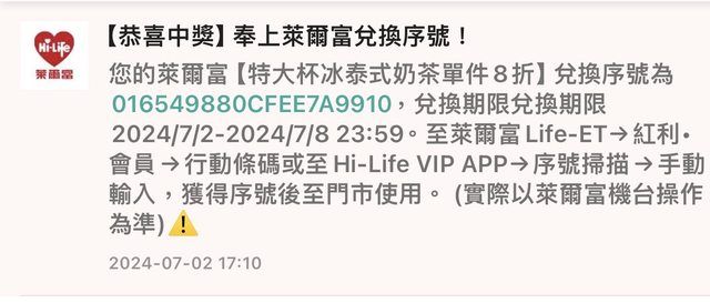 標題[贈送] 萊爾富泰奶8折序號