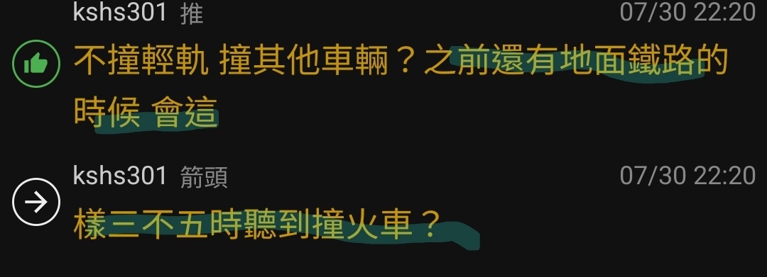 推 kshs301 : 不撞輕軌 撞其他車輛?之前還有地面鐵路的時候 會這 07/30 22:20