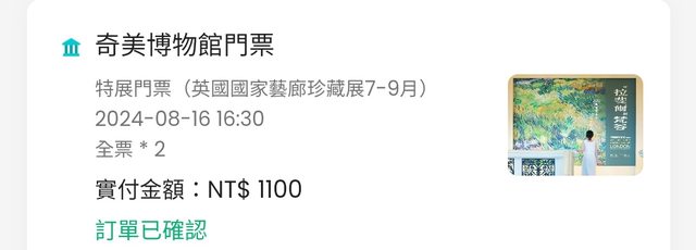 物品名稱:今日8/16下午4:30奇美博物館英國國家藝廊展門票2張(入場憑證)