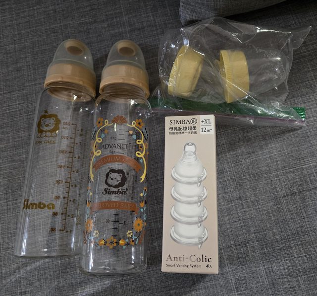 物品名稱:1.尿布兜12個。2.一般型尿布墊。 3.標準型小獅王玻璃奶瓶。 4.小獅王防脹氣