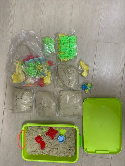 物品狀況:如圖所示,4包太空沙全新+全新玩沙工具 ,只有在玩沙盒裡的是玩過的,另