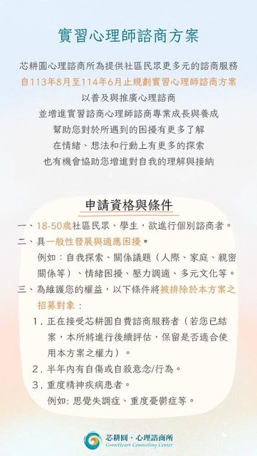 標題: [新訊] 芯耕圓 實習心理師諮商方案