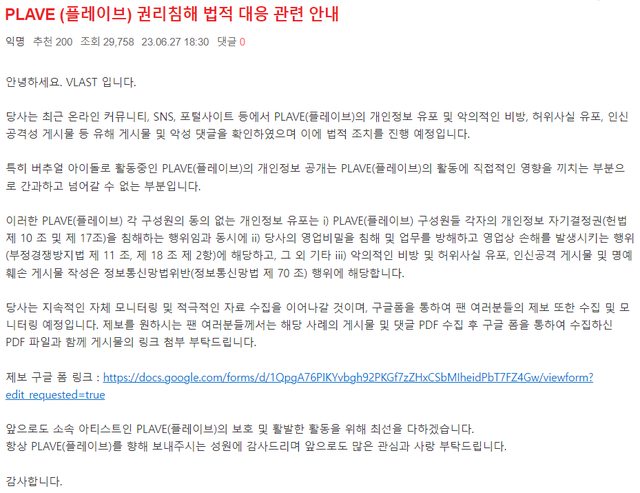 最近,我們發現社群、SNS、入口網站中,有散佈PLAVE個人訊息、惡意誹謗、散佈虛假訊