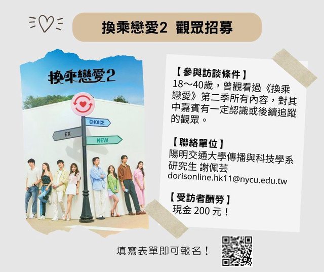 陽明交通大學傳播與科技學系正進行一項「《換乘戀愛》閱聽眾動機及感受」研究計畫,分析閱聽人對於《換乘戀愛》的創新構念與內容設計之期待與情緒反應,歡迎符合條件的觀眾們參加。