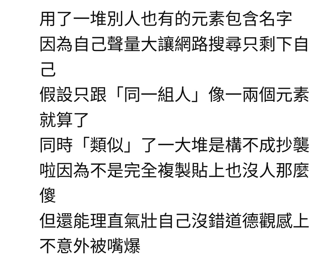 → Luvsic: 因為一般人都知道這種本來就算不上抄襲, 149.34.181.205 05/22 08:28