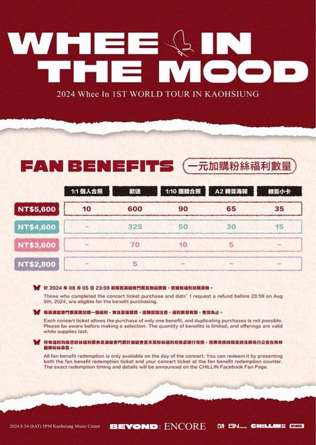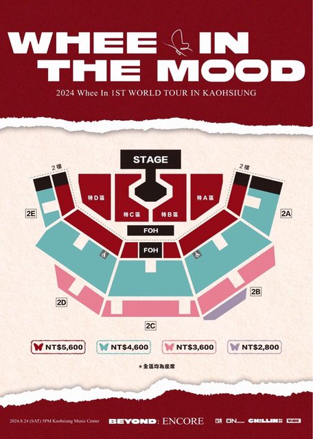 《2024 Whee In 1ST WORLD TOUR: WHEE IN THE MOOD [BEYOND] ENCORE IN KAOHSIUNG》 活動時間:2024 年 8 月 24 日(六)5PM 活動地點:高雄流行音樂中心 海音館 購票網站:https://ibontw.com/CHILLINWHEEIN(網站建置完成後開啟) 開賣時間:7 月 13 日(六)11AM https://i.imgur.com/EjHlYE1.jpeg