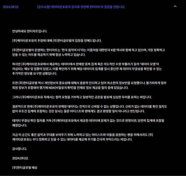 任。由於不愉快的問題,Ktown4u給Hanteo Global帶來了不便,對於對Hanteo Chart的公