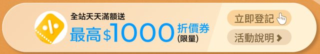全站指定品單筆滿額登記送最高$1,000折價券