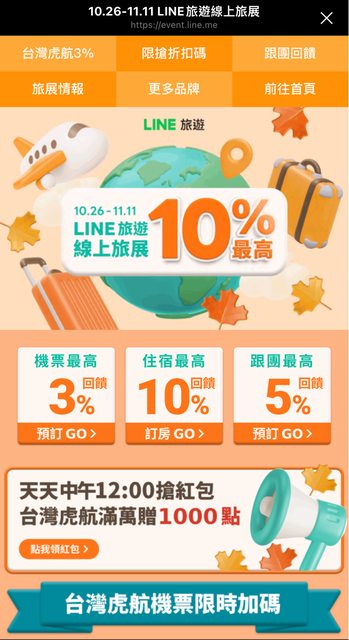 在line旅遊線上旅展期間(10/26-11/11)購買台灣虎航機票天天享3%點數回饋無上限