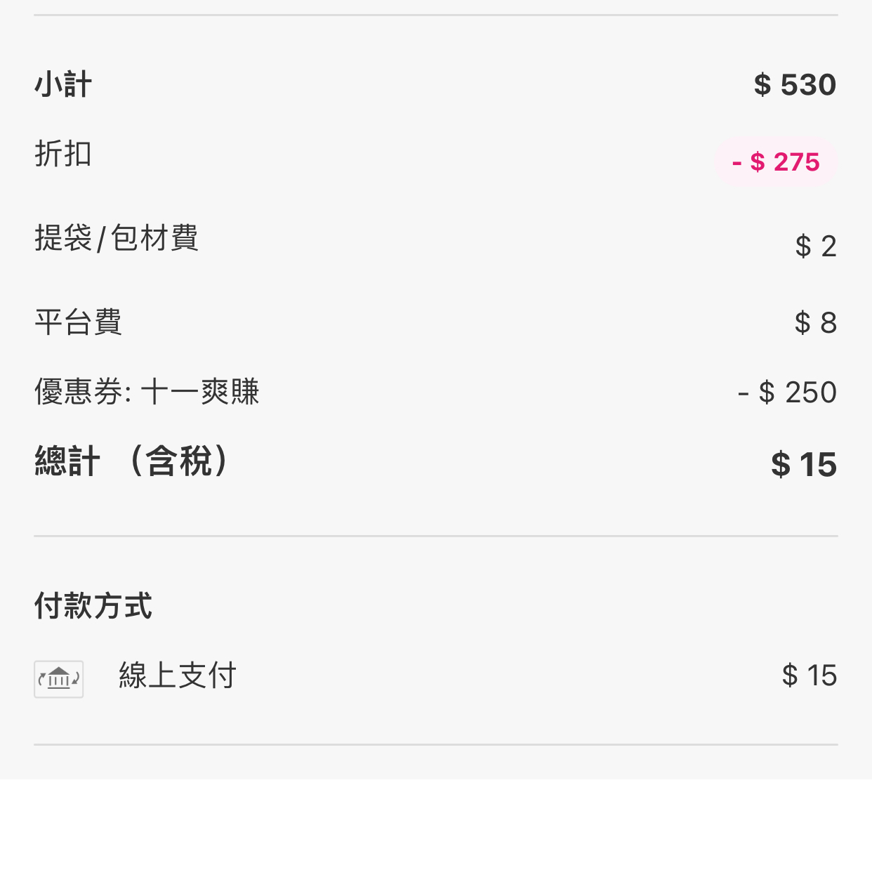 → joker4946: 我折到0元就沒收平台費,訂單還在準備 118.232.24.154 11/04 11:06