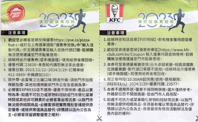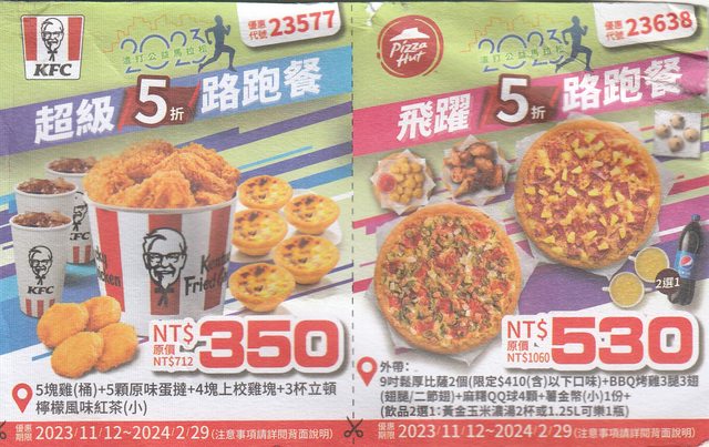 今天參加渣打馬拉松活動後發的優惠券,號稱5折不知道有沒有比較優? 肯德基23577: 5塊雞(桶)+5顆原味蛋撻+4塊上校雞塊+3杯立頓檸檬風味紅茶(小) 必勝客23638 外帶:9吋鬆厚比薩2個(限定$410(含)以下口味)+BBQ烤雞3腿3翅(翅腿/二節翅)+麻糬QQ球4顆+黃金幣(小)1份+(飲品2選1:黃金玉米濃湯2杯或1.25L可樂1瓶) https://i.imgur.com/y1ooHeM.jpg