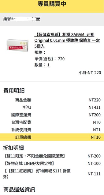 剛剛發現比比昂雙十一的免運+折扣還可以用 試疊了一下雙11券+LINE折價券可以一起用 LINE折價券:bbnline100 折下來的相模001五入只要10$ 附圖為證 https://i.imgur.com/7mZh8hL.jpg