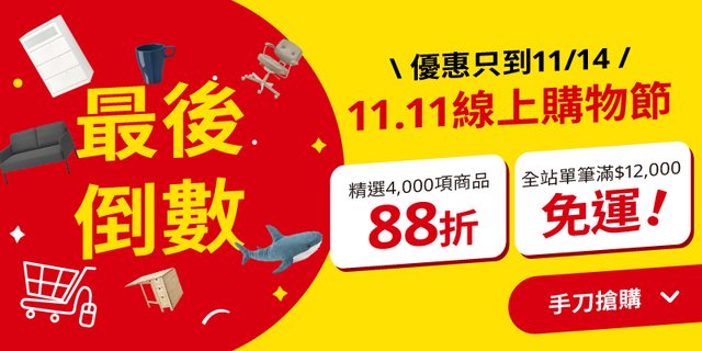 https://www.ikea.com.tw/zh/online-shopping/double11-offer 活動是從11/11-11/14 ikea官網買滿$12000免運 https://i.imgur.com/fSfO0Bs.jpg