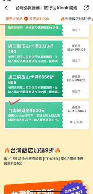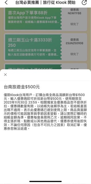 Klook台南全商品滿$1500折$500 記得要在11/30之前使用完畢 https://reurl.cc/jvjMO2 https://i.imgur.com/hex5xBw.jpg