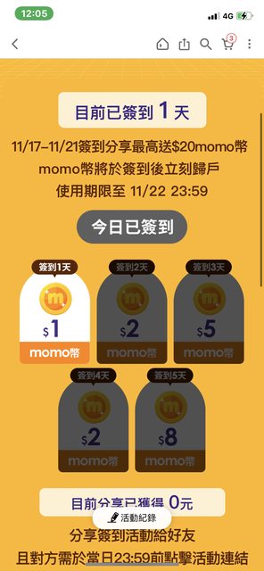 11/17-11/21簽到分享最高送$20momo幣 momo幣將於簽到後立刻歸戶 使用期限至 11/22 23:59 https://i.imgur.com/5v9Yla3.png