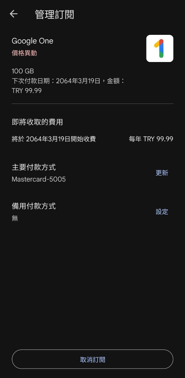 → oa0416: GOOGLE ONE也漲價了,上次看還是57.99里 223.141.25.154 11/19 10:19